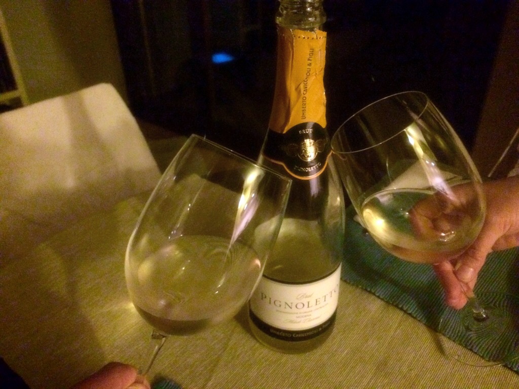 Dopo un’attenta valutazione dei potenziali, la scelta cade sulla bottiglia di “Pignoletto Cavicchioli”, messa in fresco per “aperitivizzare” prima della cena.