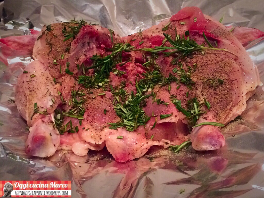 - cuocere il pollo “al cartoccio” usando un foglio di alluminio nella prima mezz’ora di cottura (come nel nostro caso)