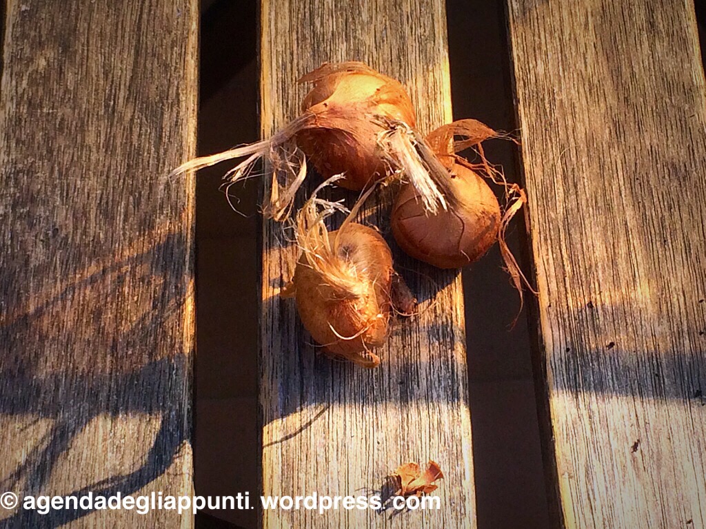Utilizzando spesso lo zafferano in cucina (e volendo dare anche un tocco di colore in più al balcone in un periodo in cui di fiori se ne vedono proprio pochi), grazie ad un collega sardo sono riuscito a procurarmi 3 bulbi di questa preziosa spezia che cara ci fanno pagare al supermercato!