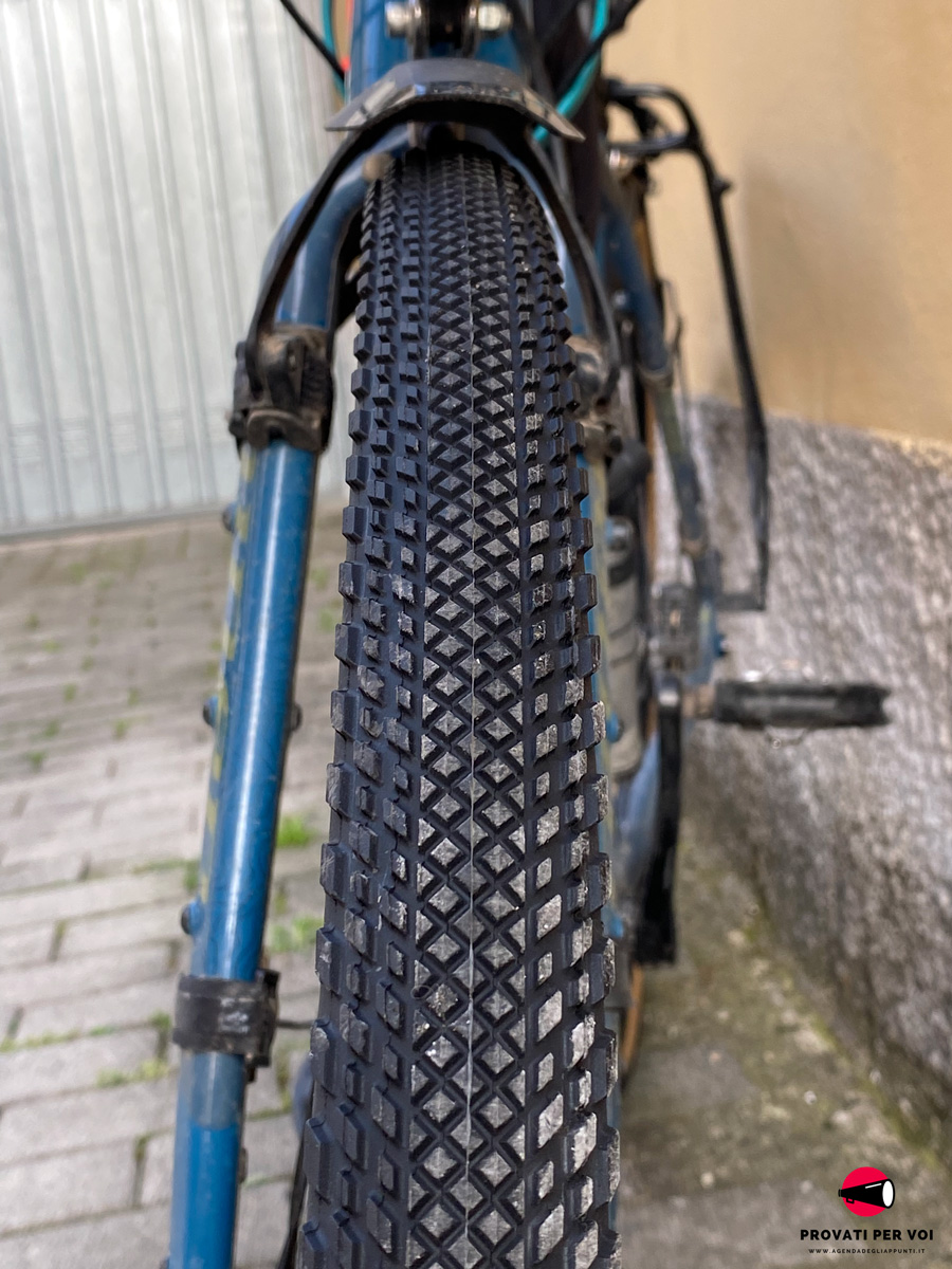 Il Gravel Thundero è sicuramente uno pneumatico che predilige terreni e fondi compatti e duri per via del battistrada centrale che lo rende molto scorrevole, ma si comporta molto bene anche sulla ghiaia e sui fondi sconnessi grazie al battistrada laterale caratterizzato da tasselli (a forma di parallelepipedo) di diverse dimensioni e altezze per un migliore grip in curva, e alla carcassa integrata da corde CRCA che massimizzano il comfort e riducono le vibrazioni [ma non le vibes, nda].