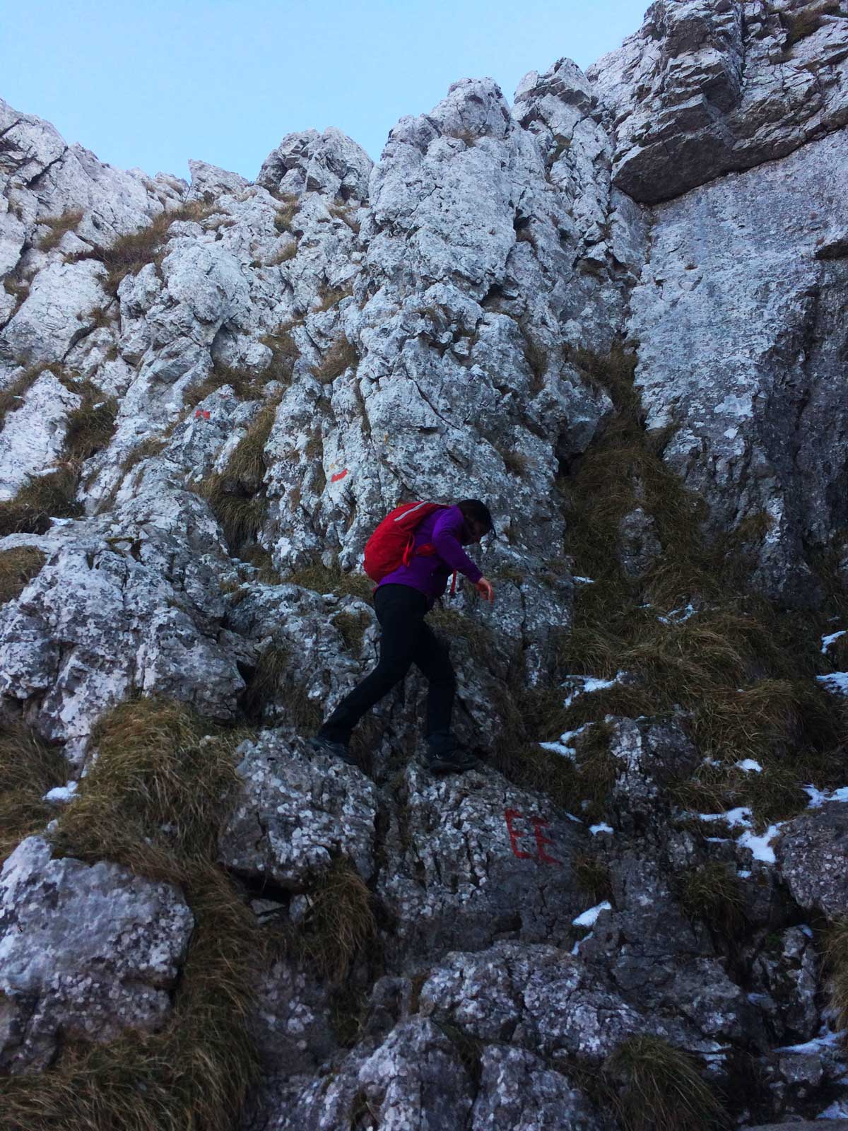 In discesa ci aspetta una paretina di roccia di II livello che, con vista aguzza e piede fermo, si supera con destrezza.