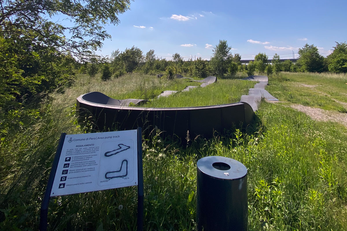 L’accesso al pumptrack di Pero è gratuito e disciplinato dall’apposito regolamento (appunto) che potete trovare impresso sul pannelo in acciaio posizionato nei pressi della parabolica di Sud-Est.